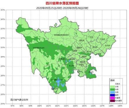 9月24日至9月25日降雨落区预报 ↑9月25日晚上到26日白天,全省阴天有小雨到中雨,其中盆地西南部、攀西地区南部局部地方有大雨。