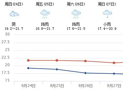 24日晚上到25日白天阴天有小雨到中雨,气温17~22℃;