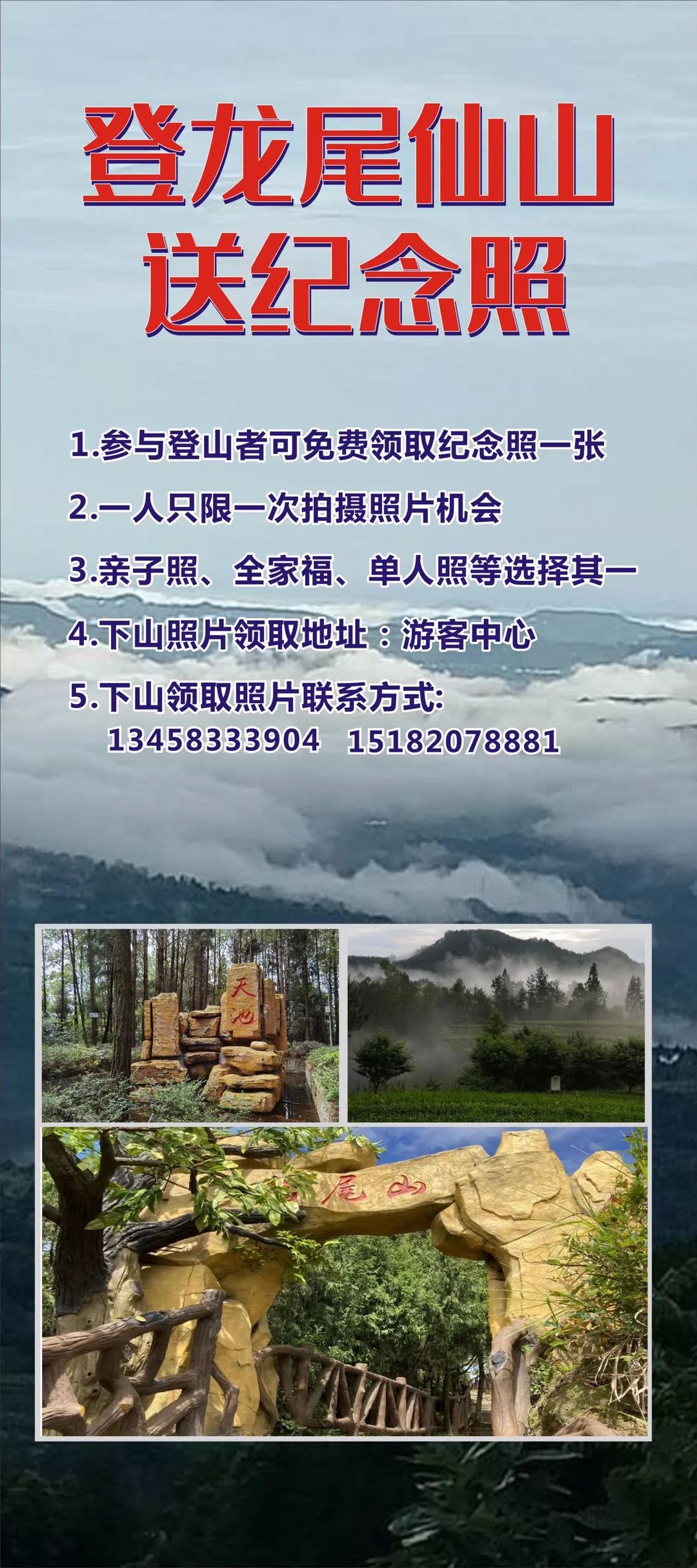 “登龙尾仙山·享森林康养”登山体验活动。组织游客登龙尾山,在小木屋休闲品茗,观赏古筝和森林瑜伽表演,赠送亲子全家福照片。