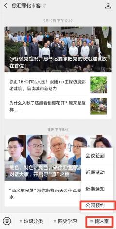 第一步:关注“徐汇绿化市容”微信公众号,点击“传达室”,进入“公园预约”。