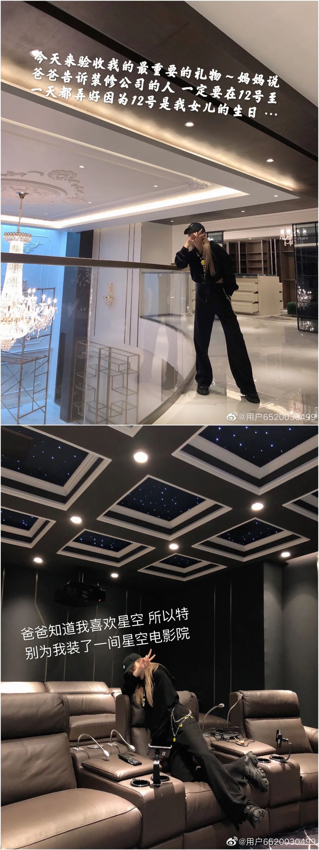 ▲ 前两天周扬青在微博小号晒出今年的生日礼物,是父母送的大豪宅,惹得一众网友羡慕不已,看这宏伟的水晶吊灯和星空顶的私家影院,就知要价金贵。