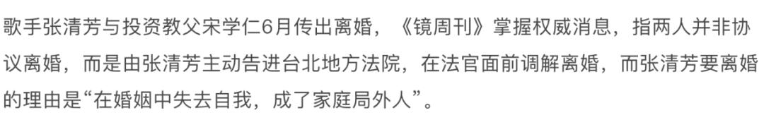 当然主动要求离婚的还有台湾女歌手张清芳。