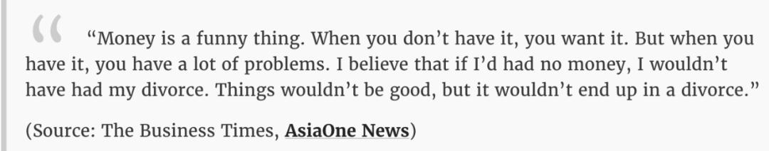 1999年抚养权争夺尘埃落定,但直到2001年才彻底解决了后续的法律官司纠纷,他分给了前妻五千万新币的赡养费。