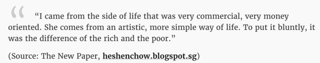 但当时的太太张玉凤(Teo Geok Fong)却在对簿公堂时声称他早年为了追求她,直接送上的是劳斯莱斯。