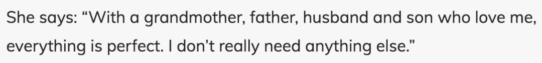 ▲ 在2019年的一次采访里,她提到对现在的生活很满足,有祖母、父亲、丈夫、儿子陪伴,自己无欲无求了。发现了嘛,只字不提她妈。