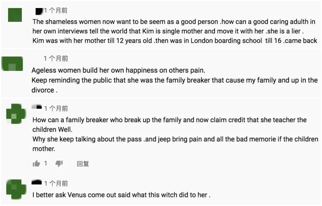 ▲ 最有趣的是,只要提到林里嫔的视频下面就有一位网友在留言里大骂她是家庭的破坏者,是把快乐凌驾于他人痛苦之上的巫婆。真让人怀疑到底是Kim亲妈还是粉丝啊。看来就算当事人想要装作若无其事,还是有人耿耿于怀呢。