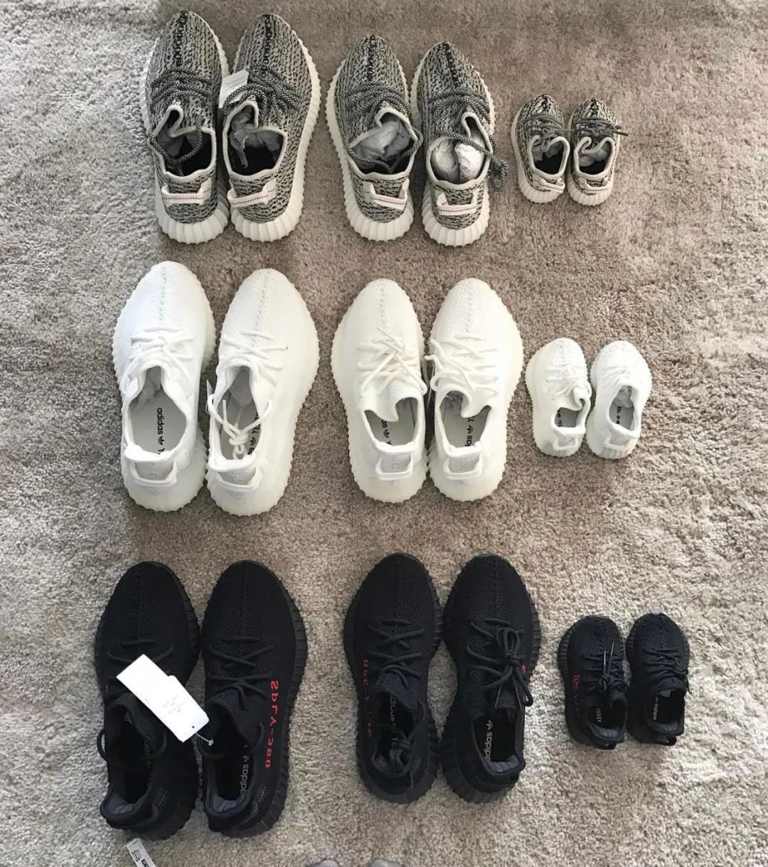 ▲ 之后Kim晒出了一家三口不同色系的椰子鞋来证明产子消息属实,有钱人的生活就是这样朴实无华,昂贵的鞋子一次来三双,而且还有不同的三款。