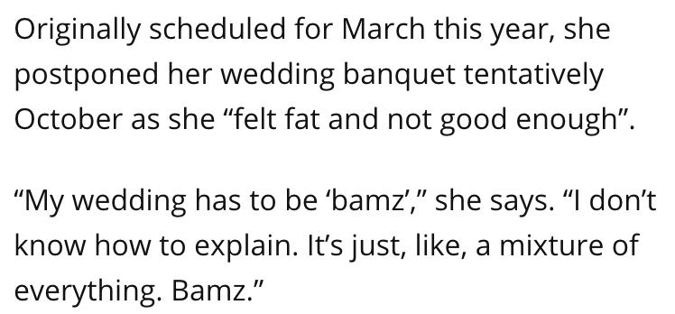 ▲ 两人本来打算在18年3月举办的婚礼,Kim对外表示因为没有瘦身成功而延期到了10月,之后更是直接遥遥无期。