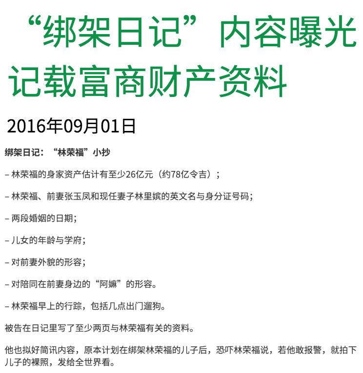 ▲ 2014年新加坡华裔富商升菘集团老板林福星的老母亲黄来宝被绑架,警方事后在主犯的绑架日记里发现林荣福全家才是他们的首选,之后林家加强了各方面安保措施来确保万无一失。
