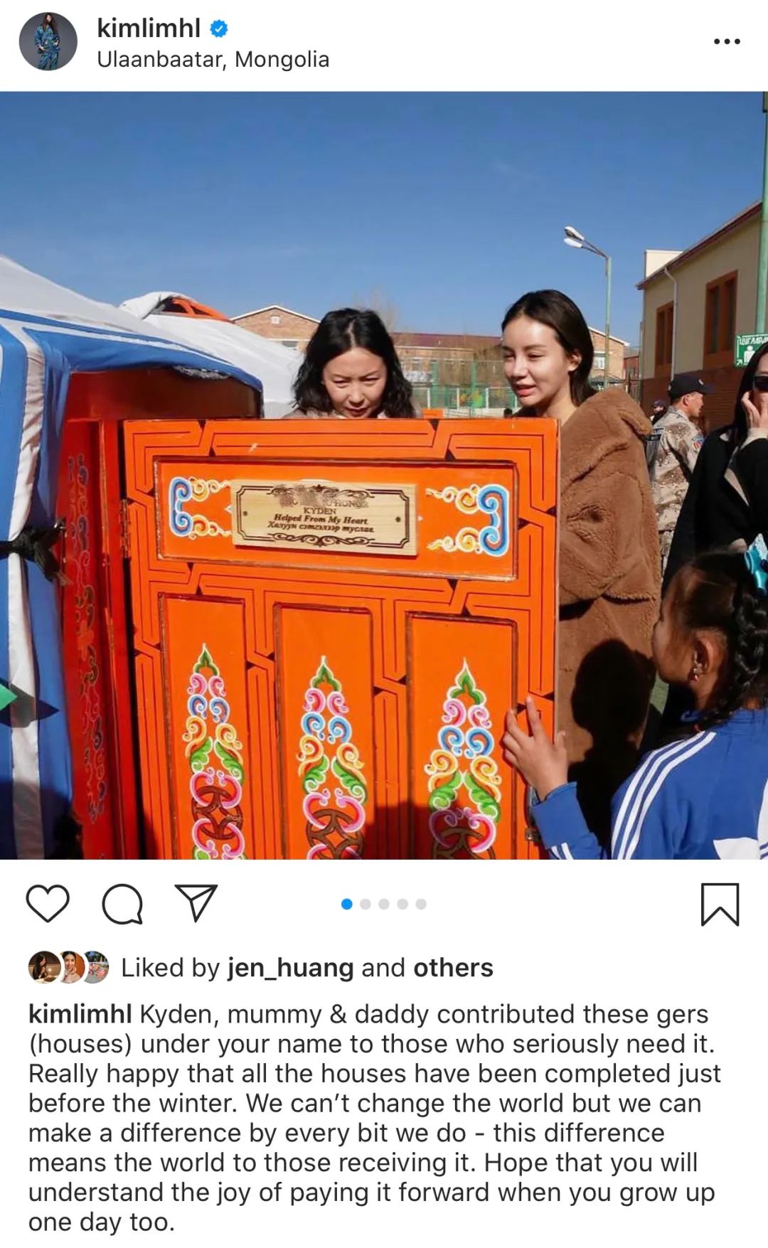 ▲ 2018年,她前往蒙古以儿子Kyden的名义修建临时房屋并给当地捐赠了食物。