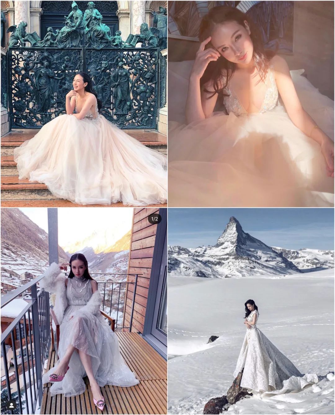 ▲ 身着婚纱从威尼斯拍到瑞士雪山,构图绝美。