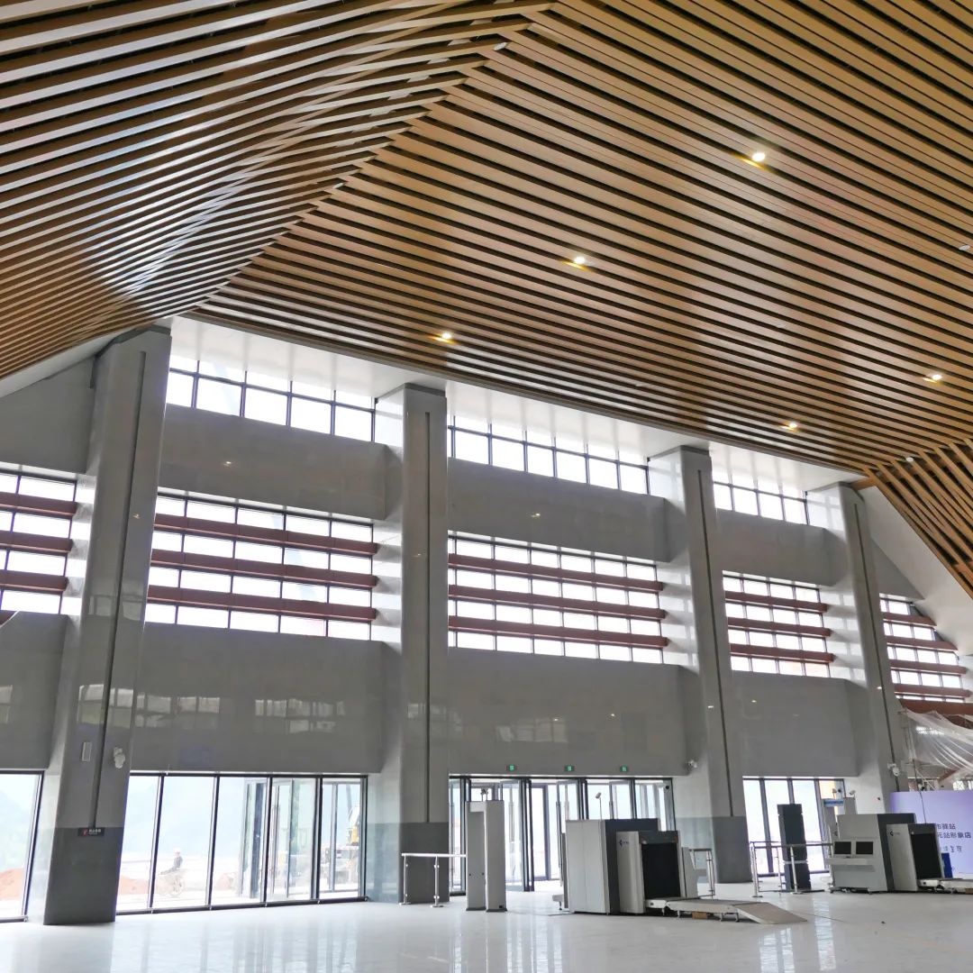 车站站房整体造型现代、简洁,提取当地具有代表性的传统建筑符号木构架及夯土墙,利用现代建构手法加以处理,既蕴含传统文化内涵又展示现代车站特色。车站站房为典型的三段式构图,中部候车大厅为阵列的竖向仿木构结构,形成人行通廊,木构之间为树枝状细部,现代简练而富有韵律,整体感觉犹如城市森林。
