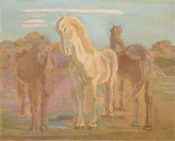 同样地,在坂本繁二郎的后印象派绘画中,他的马匹常缺乏肌肉感,空间感也不明确,但是这些都不重要,最重要的是,他的笔触、油画肌理感和颜色的选择营造了萧瑟的秋意氛围。