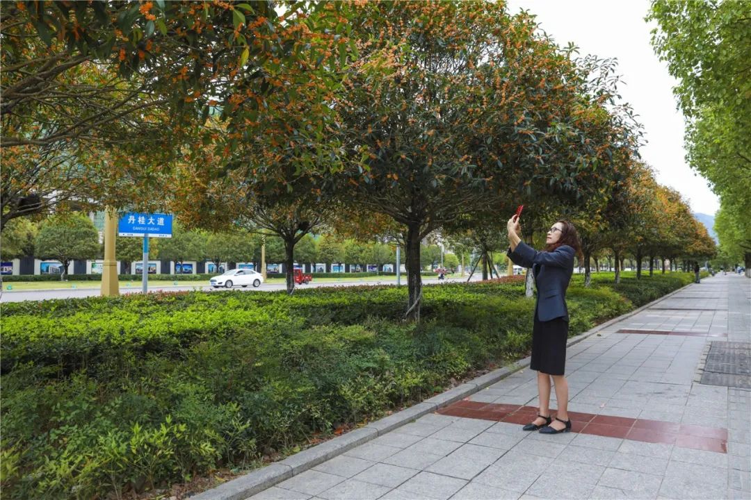 都梁新区丹桂大道盛开的丹桂吸引市民拍照留念。
