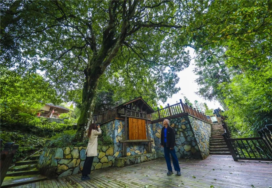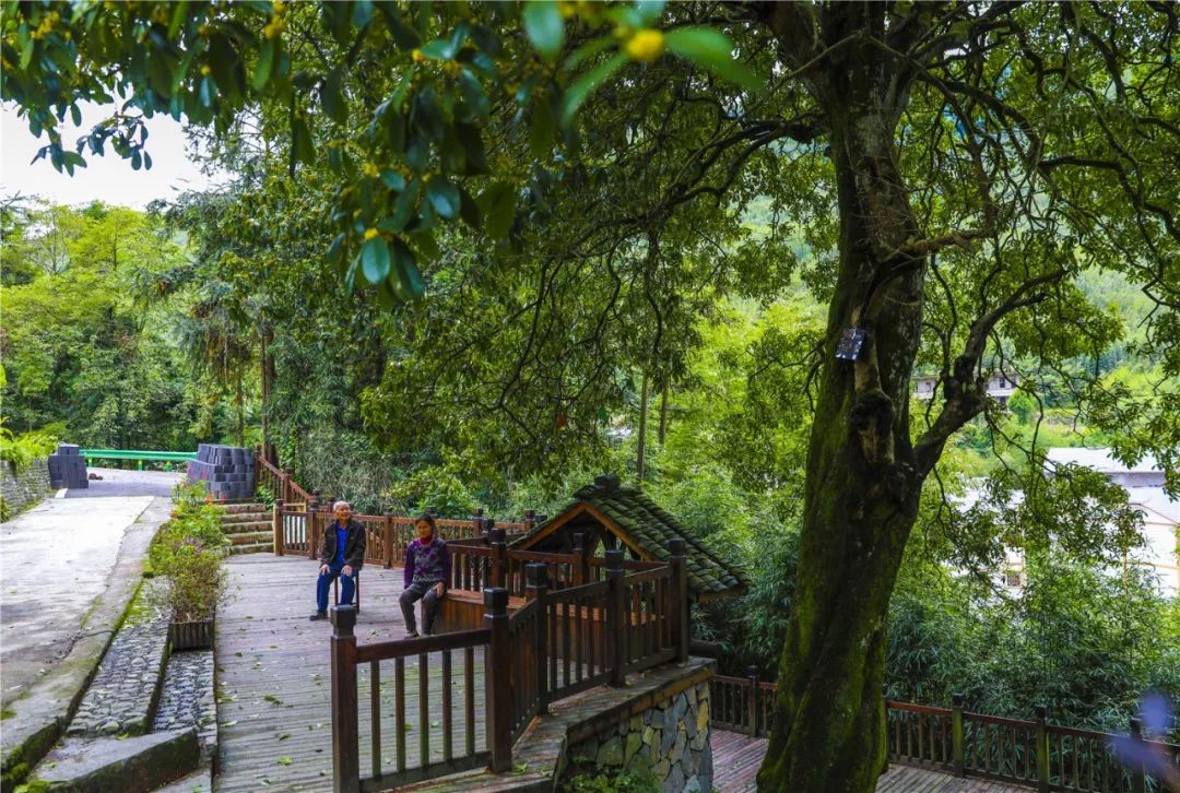 竹山镇竹丰社区一组,居民在百年金桂树下感受桂花芬芳。