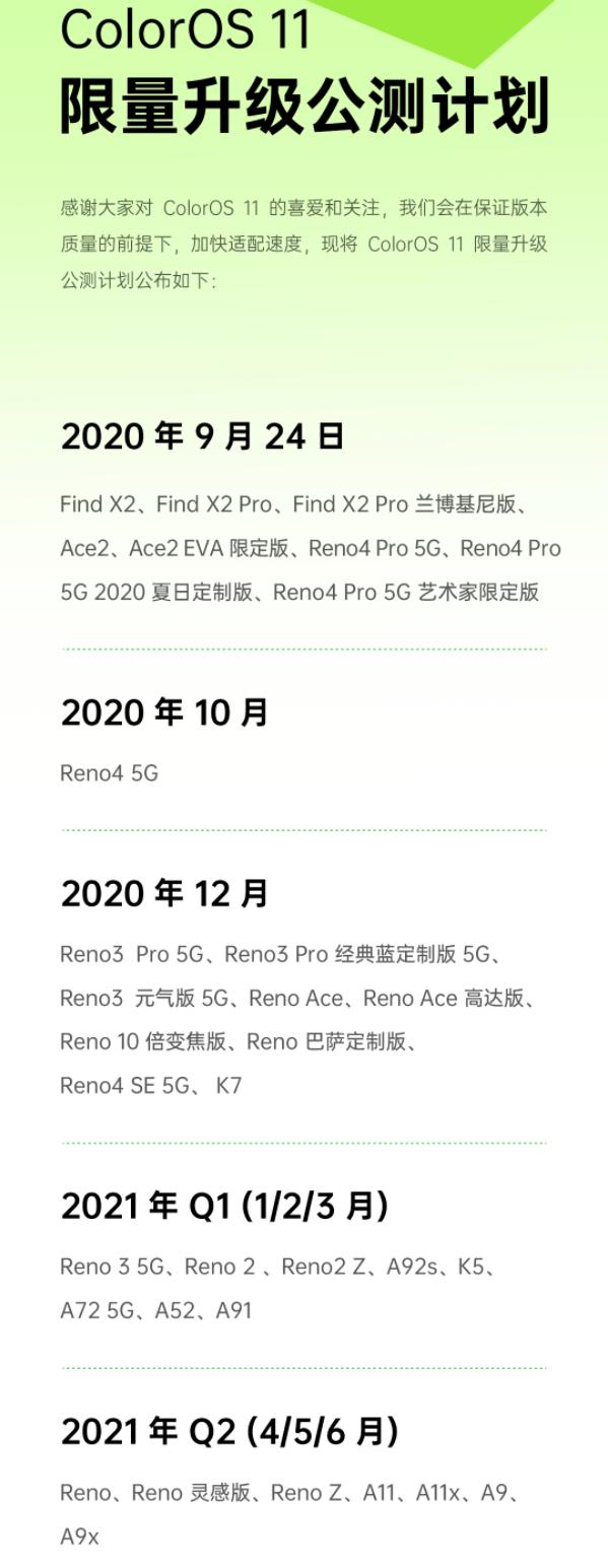 这次绿厂支持 Color OS 11 的机型还是不少的,基本涵盖了近三年来的大部分机型,想要尝鲜的话,大家可以看下自己的手机有没有在公测计划中。