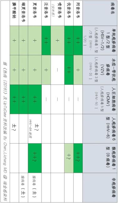 据《热病(2018)》,这些抗病毒药的抗病毒谱如下(++:一线推荐;+:有疗效,备选;±:疗效不确定;-:不推荐;?:《热病》并未明确给出推荐意见,根据《热病》其他章节、Uptodate数据库相关内容推断补充):