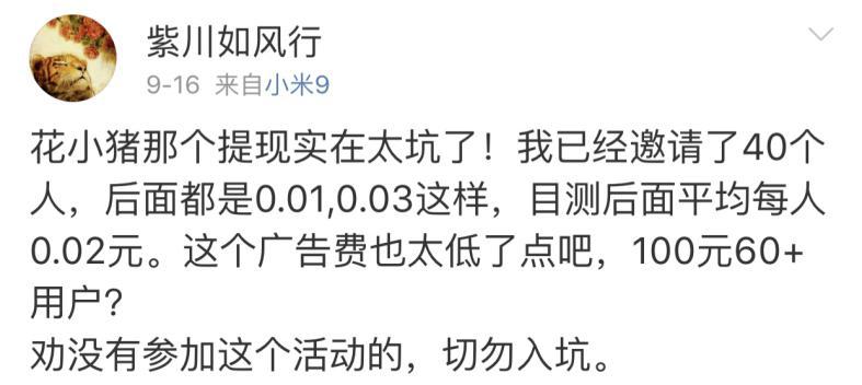 然而,此类营销很快遭遇质疑。“我觉得这个活动是一个陷阱。”山东消费者张女士向《中国消费者报》反映了她的遭遇。刚开始参加活动,马上就被告知“获得”了近90元的现金,但她按照规则连续多天参加活动,“拉”了 几十位朋友成为了花小猪APP的新用户,但“获得”98.9元现金后,再向帮花小猪”拉“新用户,账户现金就不再增加了。