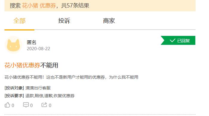 不少消费者还反映,参与花小猪有奖营销活动后领到了的优惠券,在付款时却无法使用。在黑猫投诉平台,这样的投诉也不少见。