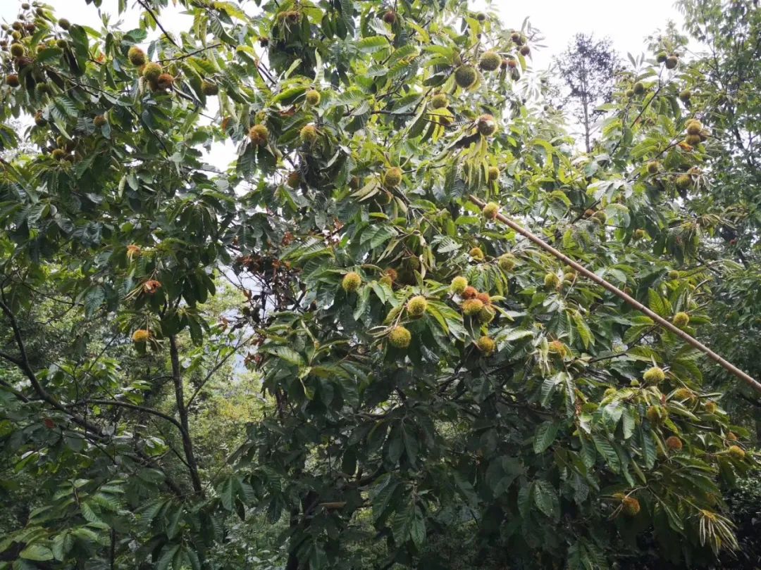 时值初秋,酷暑已过,漫山遍野的栗树枝头,挂满了沉甸甸的绿茸球,秋风吹过,“栗乡”遍野是“栗香”。一竿子下去,一个个板栗球刷刷的从枝头掉落,收获满满。