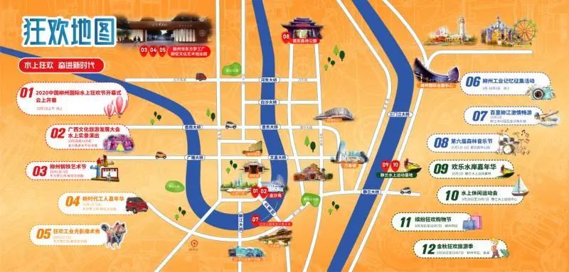 ↑一份狂欢地图带你解锁“水狂”玩法今年的水上狂欢节主体活动时间集中在10月1日至3日,其中开幕式将于10月1日举行,部分项目延续至10月7日。活动共设12项子活动,围绕山水、民俗、工业精神三大元素,策划“水上实景演出”“柳州钢铁艺术节”“新时代工人嘉年华”“水上休闲运动会”“狂欢工业光影魔术秀”等一系列文化体育活动。