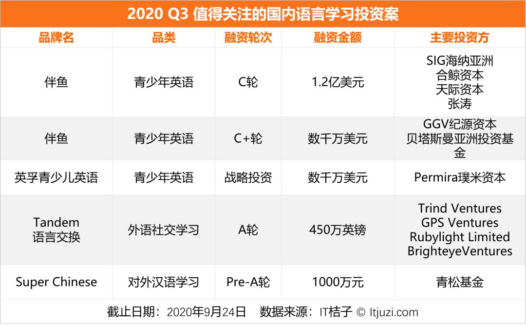 去年 10 月,VIPKID 获得腾讯 1.5 亿美元 E 轮融资;今年 Q3 伴鱼连续完成 C 轮 1.2 亿美元、C+轮数千万美元融资,迅速拉高了该赛道的融资额,也点燃了沉寂一年的少儿英语赛道。