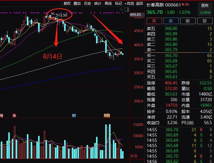 医药股中的茅台长春高新,也被贴上地域标签东北茅台,最近更是从513.5元的高位,一路下挫到347元,跌幅高达32.42%,虽然近日有所回升,但跌幅仍近30%。长春高新上市以后也是几百倍得大牛股。