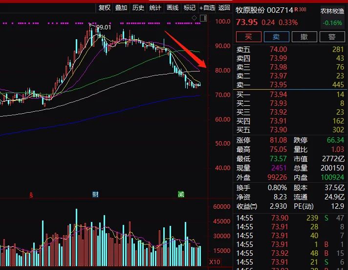 猪肉价格回落预期显现,猪茅牧原股份从7月中旬99.01元高位至今,最新收盘73.95元,跌幅达到25.31%。