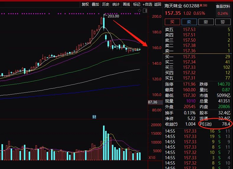 酱油茅台海天味业,估值居高不下,终于出现回落。9月3日冲高至203元后,快速杀跌,最新收盘价为157.35元,股价回落幅度达到22.49%。