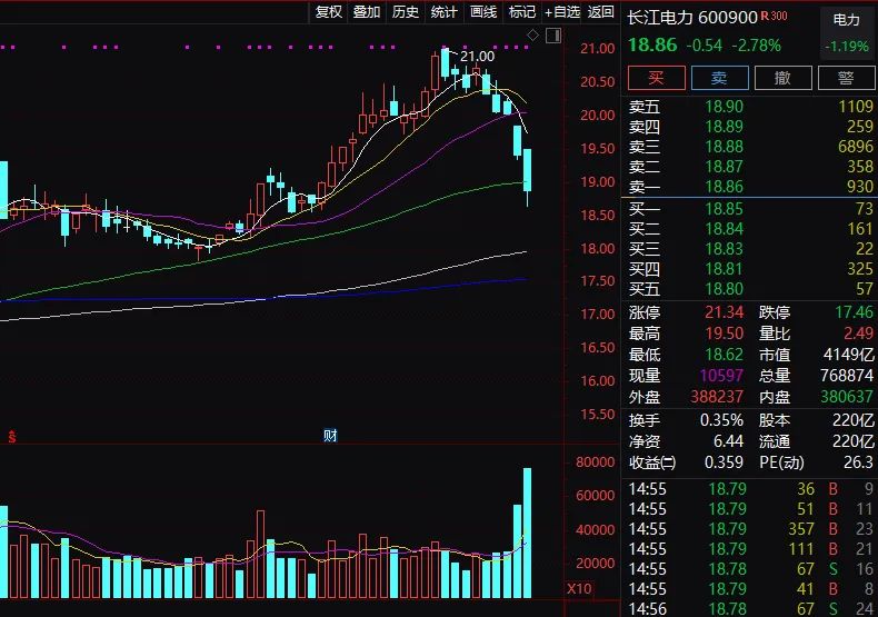 就连A股稳定业绩稳定分红的水电巨头,电力茅台长江电力近期也杀跌凶猛。短短9个交易日,从21元杀跌到18.86元。不少机构将长江电力作为相对稳定收益来源的“定海神针”。