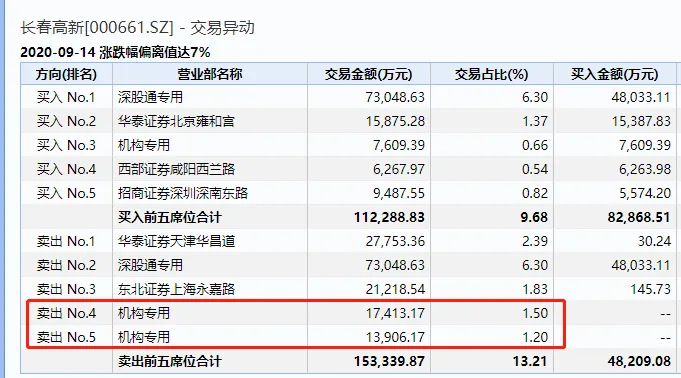 9月14日的交易席位中,长春高新遭两机构席位卖出超3亿元。