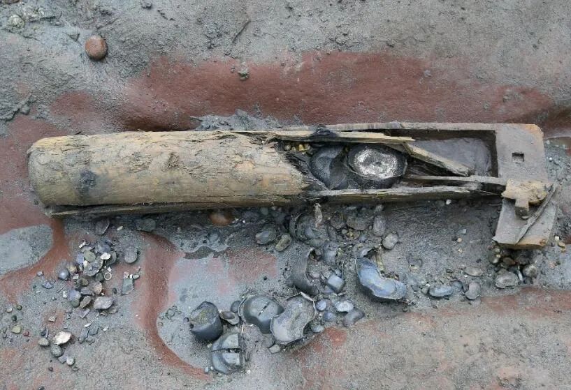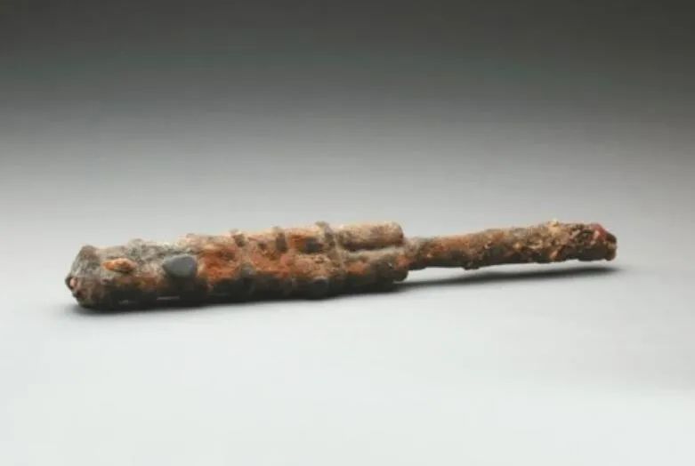 三眼火铳这件文物尽管泡于江水中数百年,已经锈迹斑斑,当年却是威力巨大的火器。既可以远距离射杀敌人,也可近战砸击。它的出水,为佐证江口遗址为战场遗址性质提供了更充分的证据,并且印证了文献中战争曾采用了火器进攻的记载。