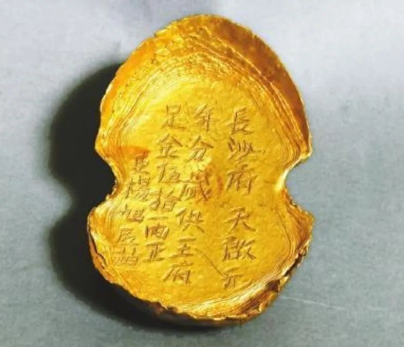 “长沙府”,即当时湖南行政区划,省治所在地,“吏杨旭”应为监铸官,“匠赵”则为熔铸此枚金锭的金匠。长沙是明王朝的一个藩封重地。藩王每年的俸禄全部出自地方财政。这应是长沙府向吉王府岁供的一种特型的金锭。1643年,张献忠亲率大西军进军湖南,同年长沙陷落。金锭当属张献忠在大肆搜罗的战果之一。