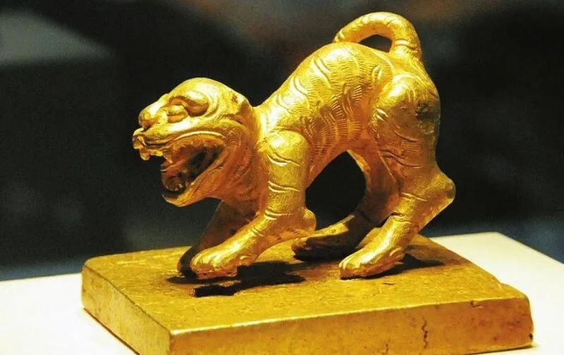 印钮为一立虎的形象,虎口大张,虎身前倾,虎尾向上卷曲,虎身阴刻线纹表现虎的鬃毛和斑纹。专家分析认为,此枚金印极有可能是张献忠本人之印。