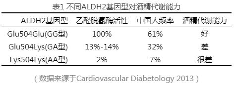 全世界范围内,大约有5.4亿人存在ALDH2基因突变。而我们东亚人群,ALDH2基因突变的频率更高(Journalof Biomedical Science (2016)23:80.)。ALDH2基因突变常发生在rs671:G > A ,从而产生3种基因型GG、GA和AA。不同ALDH2基因型对酒精的代谢能力差异很大(表1)。GG型是喝酒不脸红的,AA型是喝酒脸红的。