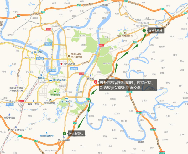 出城:1.柳州市城市道路→曙光大道→官塘收费站;