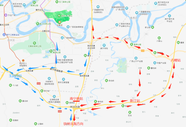 (3)从高峰收费站出站,可通过邕武路→安武大道→秀厢大道等到达西乡塘、高新区、兴宁区。