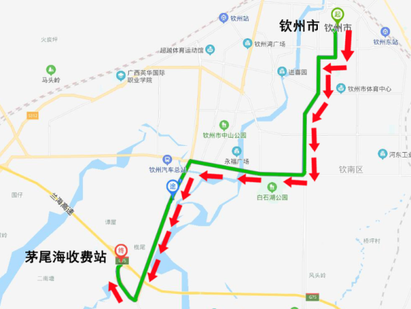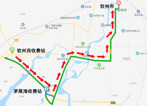 1.大塘收费站→G325国道→钦州市区