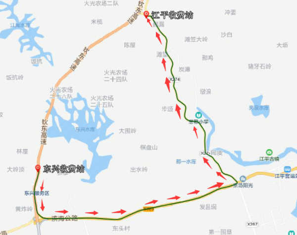 3.S43六钦高速新福收费站:往钦州方向的车辆→平朗收费站出口→X480县道→平朗乡→新福镇;往六景方向的车辆→旧州镇收费站出口→旧州镇→X304县道→新福镇方向。