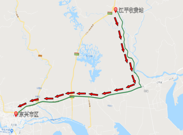 从江平收费站出站走省道S325滨海公路前往东兴市区。