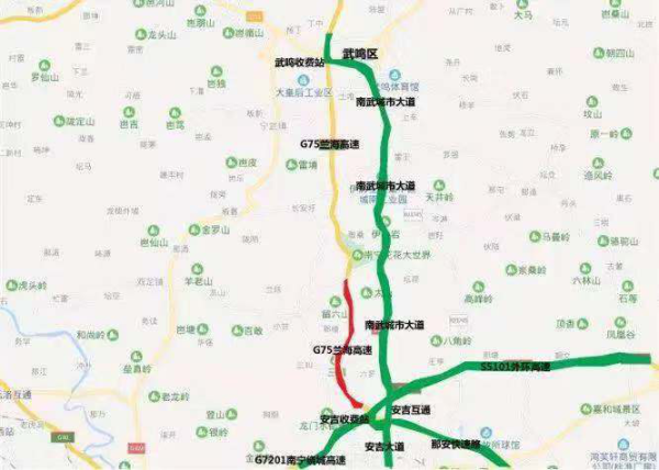 过境车辆绕行路线:当G75兰海高速武鸣至伊岭岩段发生拥堵时,贵、渝、川方向前往广东、玉林、沿海方向的车辆,可以选择绕行S40苍硕高速(贵隆高速)前往目的地。
