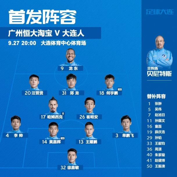大连人队:32-徐嘉敏(46’1-张翀)、4-李帅、14-黄嘉辉(U23)、3-单鹏飞(73’33-王献钧(U23))、13-王耀鹏、18-何宇鹏(U23)(63’11-孙国文)、26-崔明安、17-哈姆西克、31-郑龙(73’50-王振澳(U23)、9-龙东、20-汪晋贤