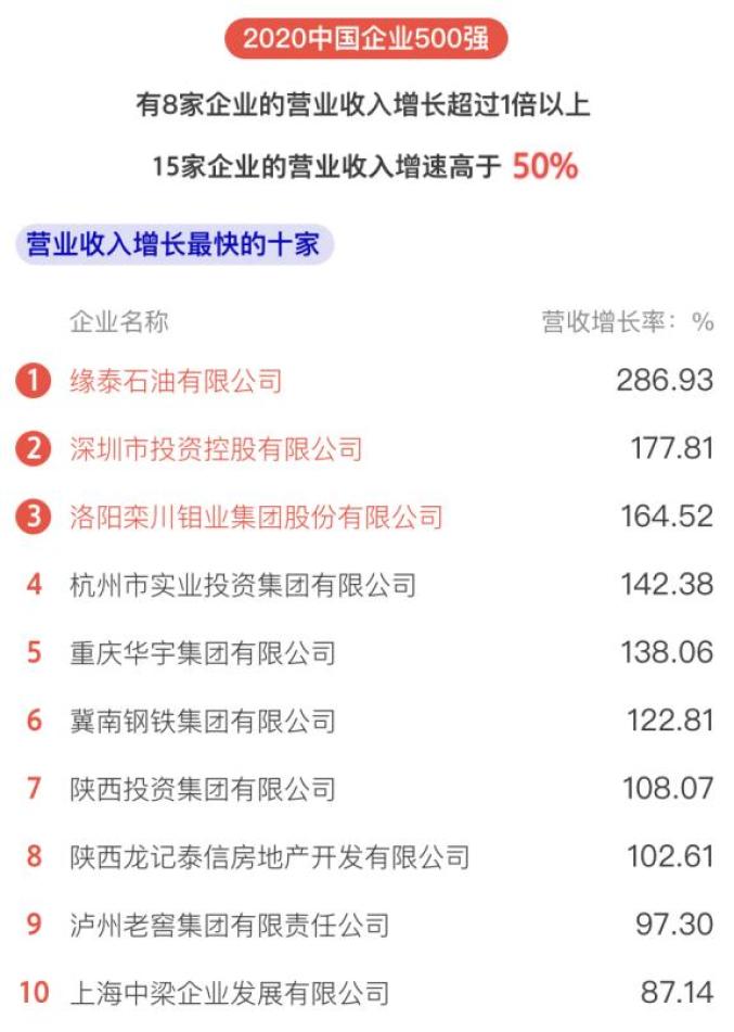 2020中国企业500强中,有8家企业的营业收入增长超过1倍以上,15家企业的营业收入增速高于50%。