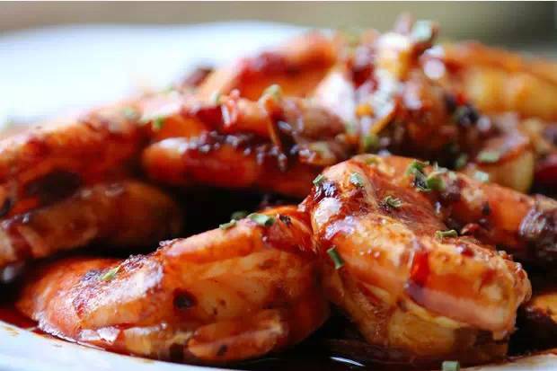 大虾开背挑纱线,去头(虾头可以炸了吃),料酒和姜腌制片刻,起油锅(可以先炸虾头 然后用虾油炒),油热后开中火,放花椒和干辣椒段,出香味后捞出。然后放五六片姜,炸干后放糖,用炒勺搅化,之后放一勺豆瓣炒出红油,再倒少许生抽,然后开大火放入虾,变色后放入葱段爆炒,出锅前30秒倒入一些香醋提香。