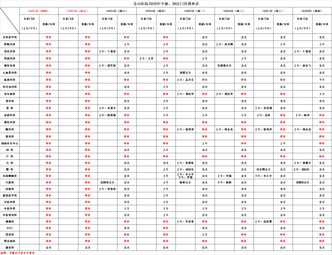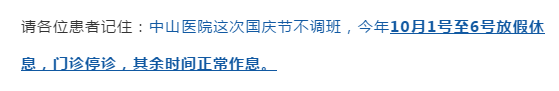 国庆、中秋节门诊停诊期间,部分专病门诊、周末特色门诊暂停开放,请广大市民相互转告,谢谢。