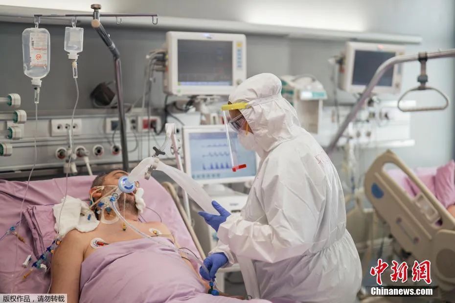 当地时间4月2日,塞尔维亚诺维萨德,医务人员在伏伊伏丁那临床中心的重症监护室照顾新冠肺炎患者。
