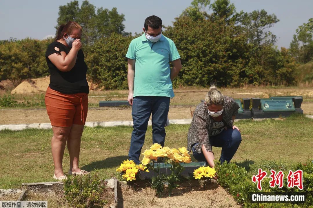 8月4日,在巴西玛瑙斯的一个墓地,亲属缅怀新冠逝者。