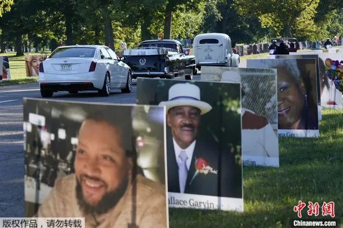 当地时间8月31日,在美国底特律的贝尔岛公园,一队车辆驶过新冠逝者的照片。