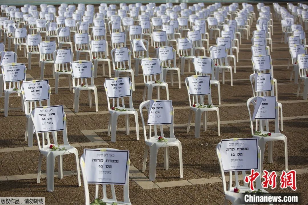 9月7日,以色列特拉维夫拉宾广场上,摆放着象征新冠逝者的1000把椅子。