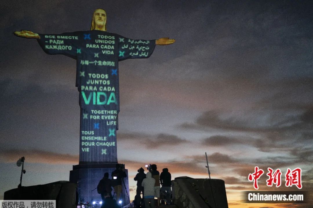 7月1日,巴西里约热内卢基督像被新冠逝者的姓名点亮。雕像上亮起各种语言的“与每一个生命同在”。